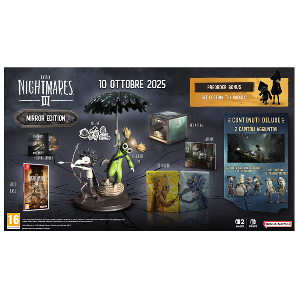 Intraprendi una nuova avventura nel mondo unico di Little Nightmares. In Little Nightmares III, segui il viaggio di Low & Alone, mentre cercano un percorso che potrebbe portarli fuori dal Nulla. Intrappolati all’interno della Spirale, un ammasso di luoghi inquietanti, i due amici dovranno lavorare insieme per sopravvivere in un mondo pericoloso pieno di illusioni e sfuggire alla morsa di una minaccia ancora più grande in agguato nell’ombra.